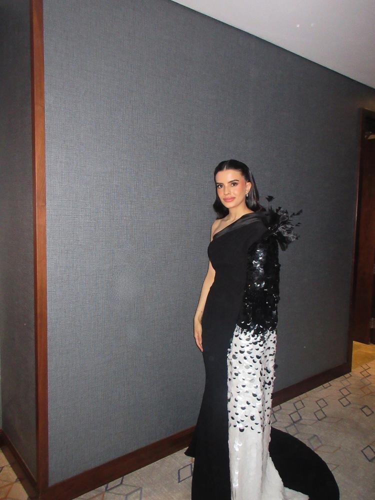 فستان سهرة فاخر بتصميم كتف واحدة بالألوان الأسود والأبيض
